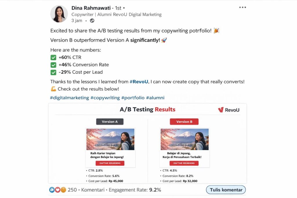 - Buat A/B testing sendiri – Kalau punya produk sendiri (bisa jasa atau affiliate), test copy dari kelas. Screenshot data performanya. Ini bikin portofolio kamu makin kuat.